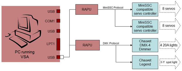 Example 2. In this example, the RAPU is acting as a repeater. VSA is sending the commands and is controlling 16 MiniSSC-compatible servos, 4 DMX 20-Amp stage lights, and 1 DMX X-Y scanning spot light. Using the RAPU as a repeater allows legacy serial devices to be connected via USB and enables DMX device control.