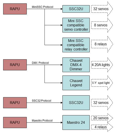 Example 1. In these example setups, three independent RAPU's are controlling several different device types. As many as 64 devices (128 DMX devices) may be controlled from a single RAPU. The RAPU itself may be controlled by the onboard LCD and pushbuttons, the IR remote control, or an external RS232 device (such as an Arduino or custom microprocessor). Only one of the RAPU's output ports (serial, DMX, or TTL) may be used at any one time.