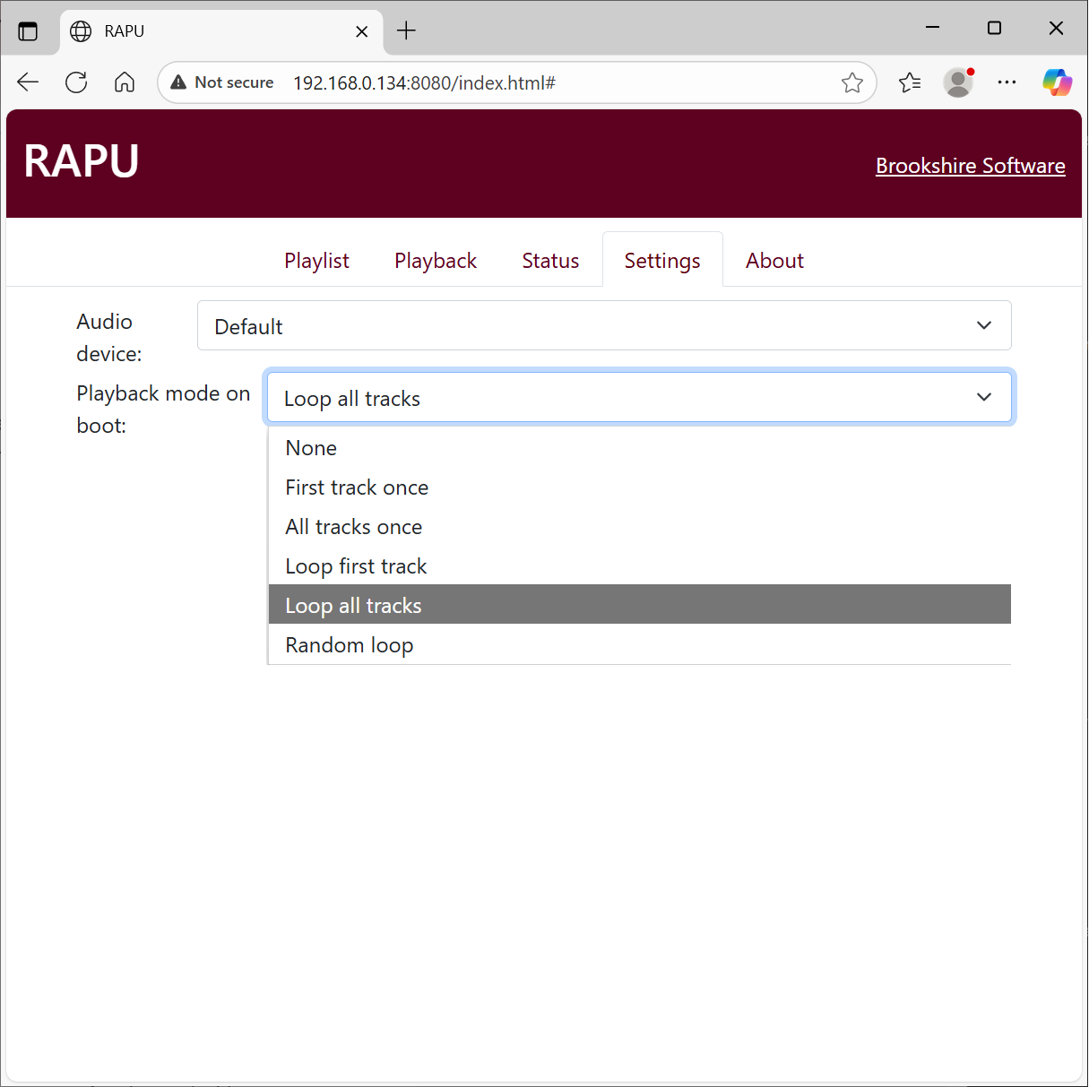 The Playback mode on boot indicates the playback mode that will be used when the device starts up. This mode only applies when Start on boot is enabled (see Settings).